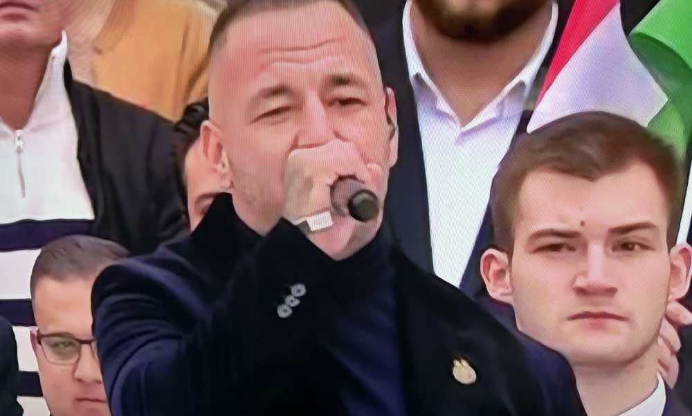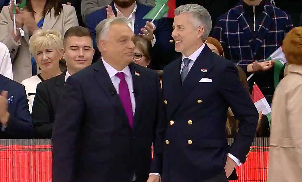 A TV2 műsorvezetője a színpadon is közvetlenül Orbán Viktor mögött ült. Mellette kapott helyet a Luxusfeleségekből ismert Vasvári Vivien. De ott ült Eperjes Károly is, aki a miniszterelnök beszéde alatt egy rózsafüzérrel a kezében imádkozott.