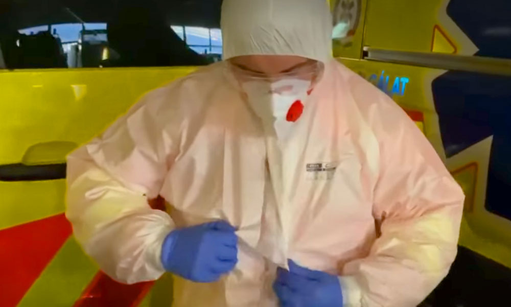 Videón mutatta meg az Országos Mentőszolgálat, hogyan veszik le a koronavírus ellen használható védőfelszerelést a mentősök. Három gumikesztyűt hordanak, a negyedikkel pedig a harmadikat veszik le.