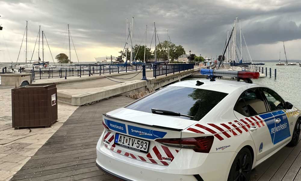 Kiemelt kép: Rendőrautó a balatonfüredi kikötőben – A fotó illusztráció, Adobe AI generatív mesterséges intelligencia felhasználásával készült