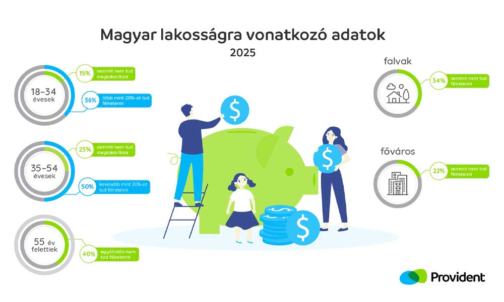 Az elmúlt években tapasztalt jövedelmi és vagyoni egyenlőtlenségek miatti frusztráció, valamint az infláció kiugró mértéke jelentősen növelte a társadalmi szakadékot. A Provident Pénzügyi Zrt. anyavállalatának (International Personal Finance – IPF) megbízásából készült, 9 Provident országra kiterjedő reprezentatív kutatás szerint a magyar lakosság csaknem fele (47,7 százalék) legfeljebb jövedelme 20 százalékát tudja félretenni hónap végén. A helyzet különösen aggasztó azok esetében, akik teljesen megtakarításképtelenek: jelenleg a válaszadók 27,1 százaléka fizetéstől fizetésig él és egyáltalán nem tud félretenni. Ez az arány folyamatosan emelkedik: 2022-ben még „csak” 21,1 százalék volt, 2023-ban és 2024-ben ez már meghaladta a 25 százalékot, idén pedig elérte a 27,1 százalékot a megtakarítani képtelenek aránya. Nemzetközi összevetésben is látványosak a különbségek: míg a Provident más európai piacain – Lengyelországban, Csehországban és Romániában – átlagosan 18,6 százalék nem képes megtakarítani, a négy ország közül nálunk a legrosszabb a helyzet.