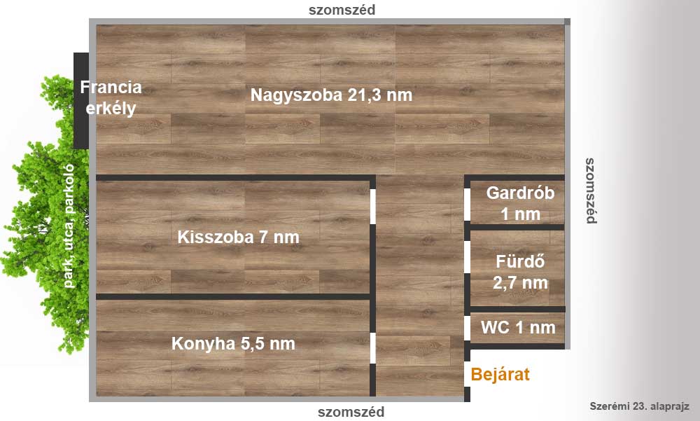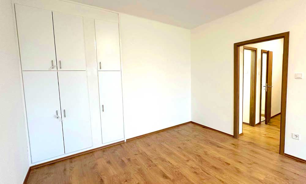Elosztás: hálószoba, nappali, konyha, gardrób, fürdőszoba, wc. Új a bejárati ajtó, új a Boss bojler, a lakás árában benne van az új gépesített konyhabútor. Nagy tároló is tartozik a lakáshoz.