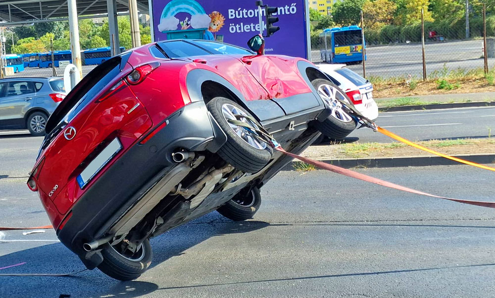 A kivonuló fővárosi hivatásos tűzoltók áramtalanították a járműveket, a tetején heverő Mazdát pedig két autómentő állította vissza a kerekeire.