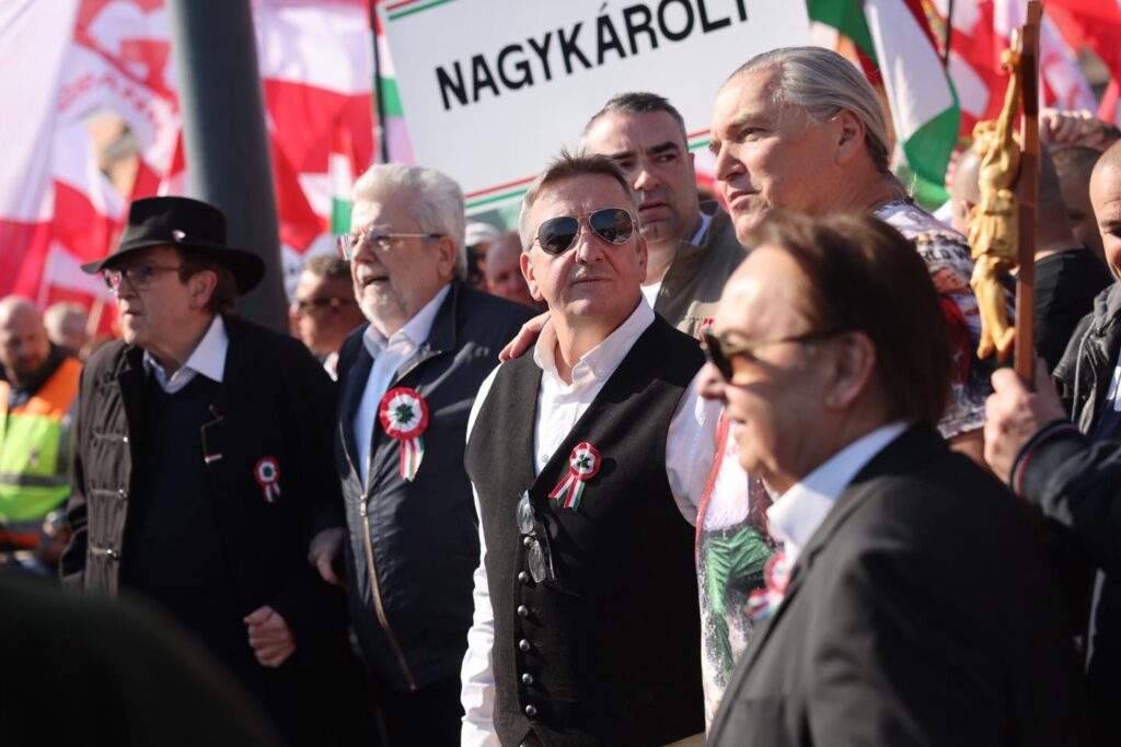„Nem leszünk ukrán gyarmat” – felirattot visznek a menet elején. A Békemenethez idén is több ismert ember csatlakozott. Ott van a tömegben Szabó Zsófi, aki tavaly Orbán Viktor mögött ült a színpadon és a Háborúellenes gyűlések műsorvezetője volt. Fásy Ádám, Győzike, Kis Grofó, Tóth Gabi is csatlakozott a menethez.