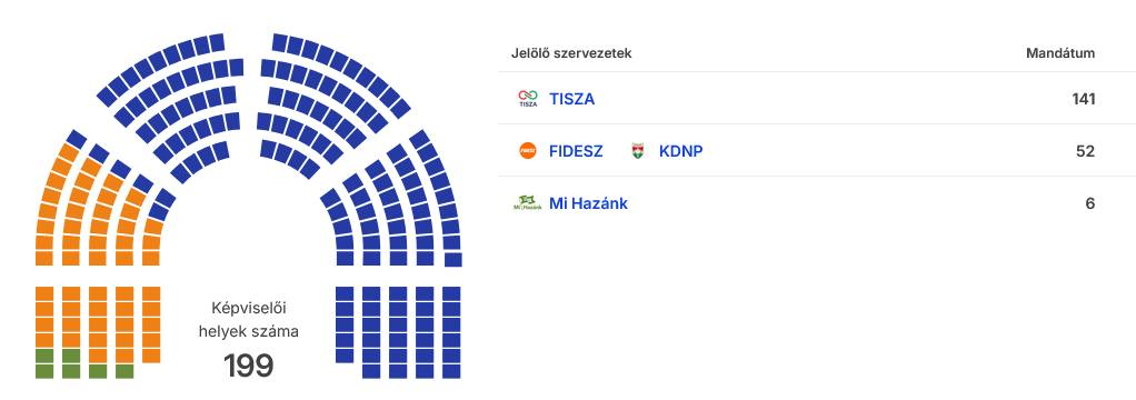 A Tisza Párt a vasárnap esti eredményhez képest még tovább növelte mandátumai számát: összesen 141 mandátumot szerzett a 199 fős Országgyűlésben. Mivel 133 mandátumtól van kétharmad, ez bőven alkotmányozó többséget jelent.