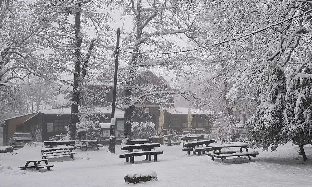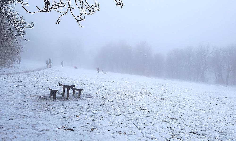 Reggel 7 óra körül még -3 fok volt, folyamatosan enyhül az idő, de azért nem kapkodja el, még 10 óra magasságában is 0 fok alatt volt a hőmérséklet. Szélcsend van, de nyirkos, ködös a reggel/ délelőtt. Tegnap ugyan volt eső, de a pár centis hó megmaradt foltokban – főleg a fákon, réteken. Sportolásra alkalmatlan a hó, ezért ma is azt kérjük, a szánkó helyett inkább túrabakancsot hozzatok – lehetőleg olyat, ami nem csúszik. Aki feljön a hegyre, óvatosan közlekedjen, az utakon, sétányokon is vannak jégfoltok.