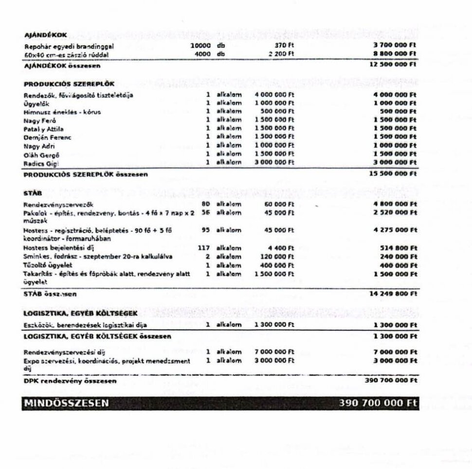 A dokumentum szerint Nagy Feró, Pataky Attila, Demjén Ferenc, Oláh Gergő egyenként másfélmillió forintot, míg Radics Gigi 3 millió forintot kapott a fellépésért, Nagy Adri egymilliót. Mivel az összegek együtt nem teszik ki a lap alján említett 390 millió 700 ezer forintot, így valószínűleg ez csak egy részlet a költségekből. A BudapestKörnyéke.hu hírportál legfrissebb híreit ide kattintva éred el! A Facebookon már 700 ezernél is többen követik a portáljainkat, köszönjük, hogy most te is minket olvasol!