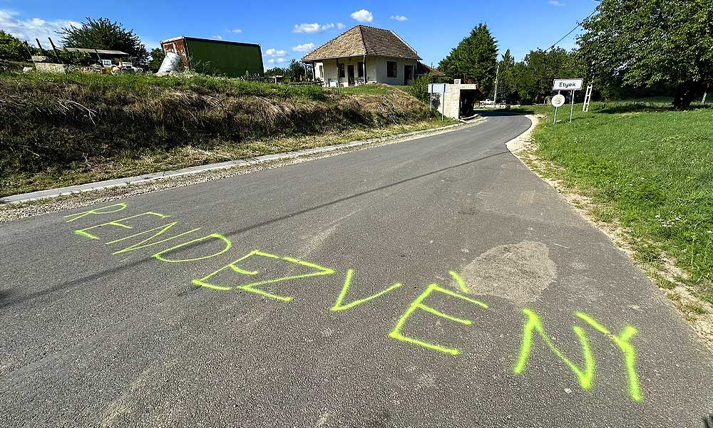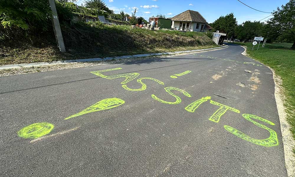 Valakik már felismerték az óriási veszélyt és azok helyett, akik valóban tehetnének a biztonságért egyszerűen az aszfaltra írták a bringásoknak, hogy lassítsanak le. Ottjártunkkor nem nagyon hatotta meg az aszfaltra festett szöveg az érkező kerékpárosokat, ha ismét ott állt volna egy teherautó, ismét tragédia történt volna.
