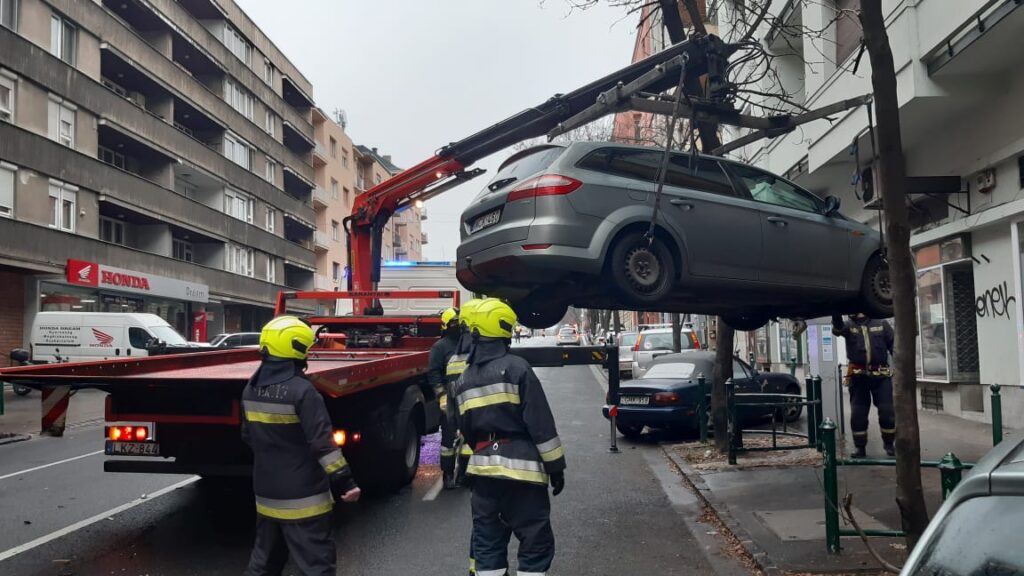 A fővárosi hivatásos tűzoltók darus autómentőjük segítségével a Fordot a parkolóba emelték. A furgon sofőrje elismerte, hogy ő okozta a balesetet, viszont az állítólagos elé bevágó autó viszont elhajtott a helyszínről.