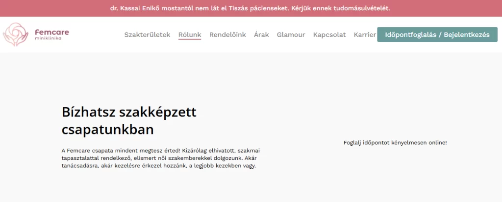 Ha valaki rámegy a Femcare Minklinika weboldalára, egy szokatlan üzenet fogadja. Az oldal tetején megjelenő bannerben ugyanis azt írják, hogy „dr. Kassai Enikő mostantól nem lát el Tiszás pácienseket. Kérjük ennek tudomásulvételét” – vette észre a 444.hu. A klinika oldala, a cikk megjelenése óta nem elérhetetlen lett. A BudapestKörnyéke.hu hírportál legfrissebb híreit ide kattintva éred el! A Facebookon már 700 ezernél is többen követik a portáljainkat, köszönjük, hogy most te is minket olvasol!