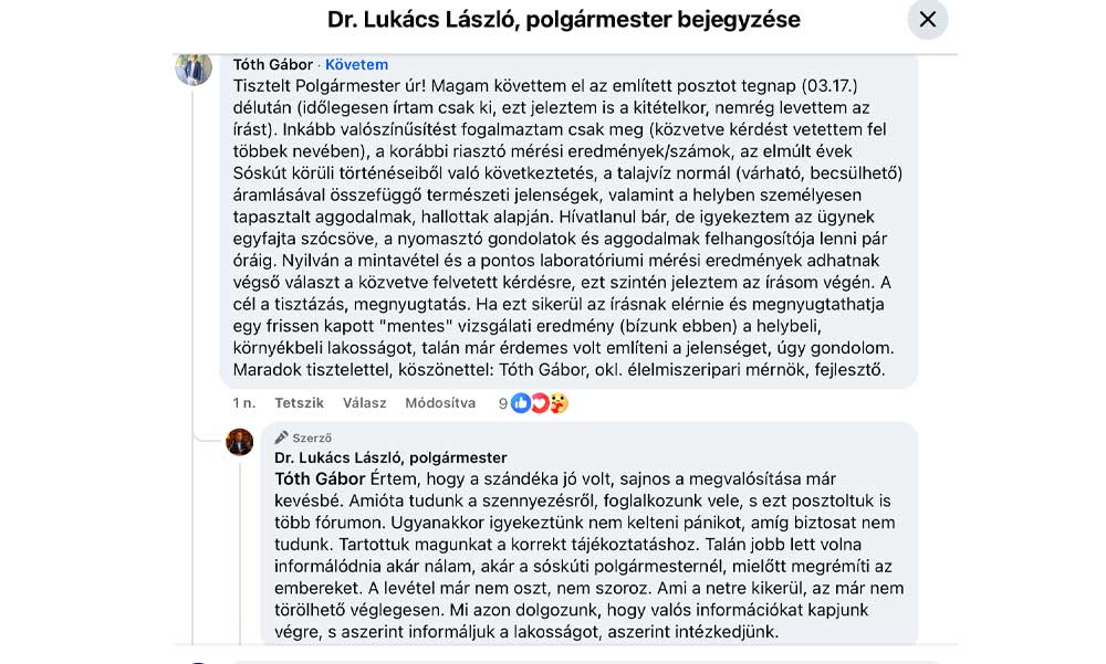 Lukács László, Tárnok polgármestere ezután leteremti a balhét szító mérnököt. Így fogalmaz: „Értem, hogy a szándéka jó volt, sajnos a megvalósítása már kevésbé. Amióta tudunk a szennyezésről, foglalkozunk vele, s ezt posztoltuk is több fórumon. Ugyanakkor igyekeztünk nem kelteni pánikot, amíg biztosat nem tudunk. Tartottuk magunkat a korrekt tájékoztatáshoz. Talán jobb lett volna informálódnia akár nálam, akár a sóskúti polgármesternél, mielőtt megrémíti az embereket. A poszt levétele már nem oszt, nem szoroz. Ami a netre kikerül, az már nem törölhető véglegesen. Mi azon dolgozunk, hogy valós információkat kapjunk végre, s aszerint informáljuk a lakosságot, aszerint intézkedjünk.” A mérnök és a polgármester posztját a cikkünk alján éred el.